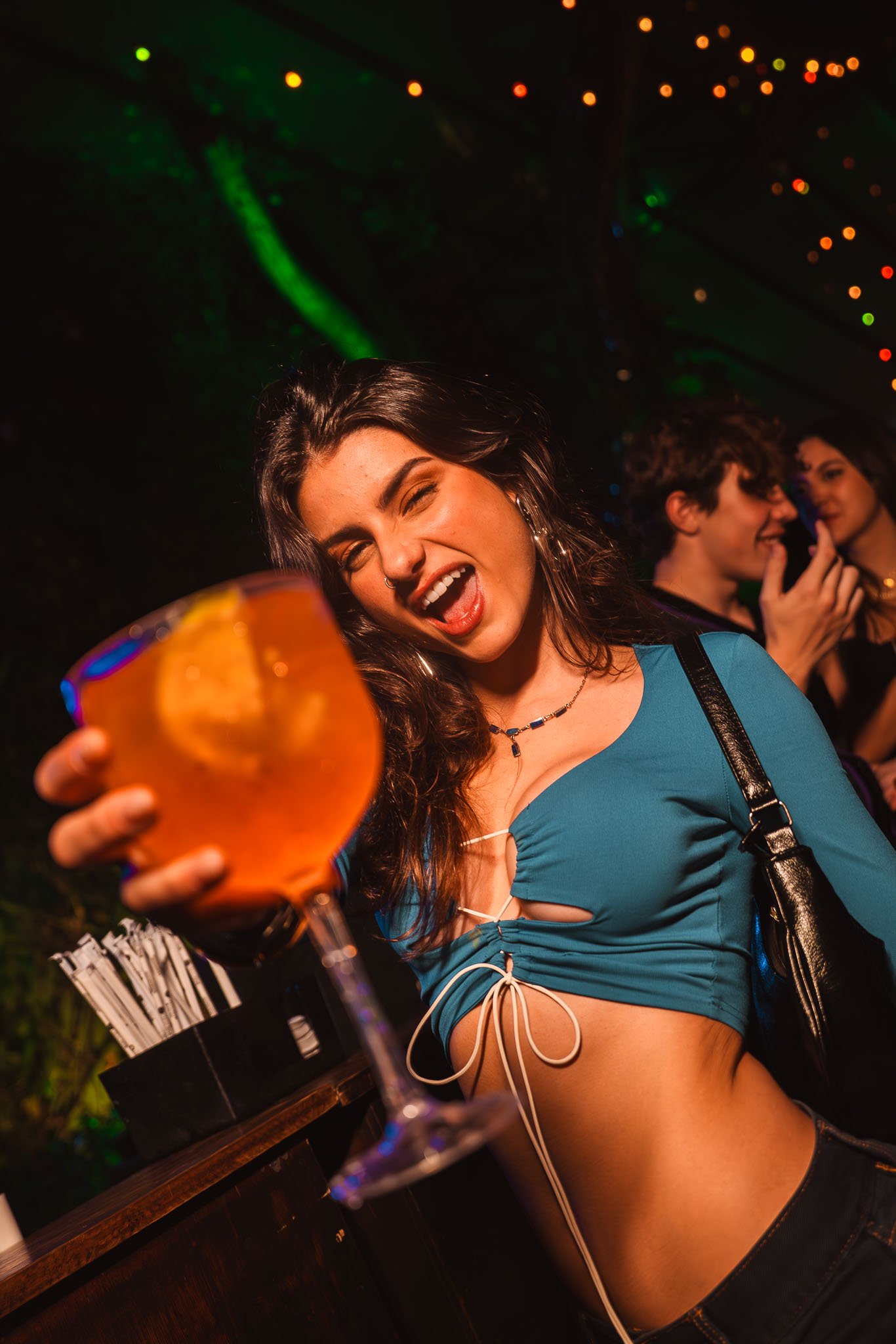 Entre o calor da pista e o charme dos detalhes, registramos a preparação cuidadosa do drink — o ritual do bartender, a textura da taça, o gelo refletindo a luz da noite — e os sorrisos que surgiam ao receber a bebida, criando uma narrativa leve e sedutora.